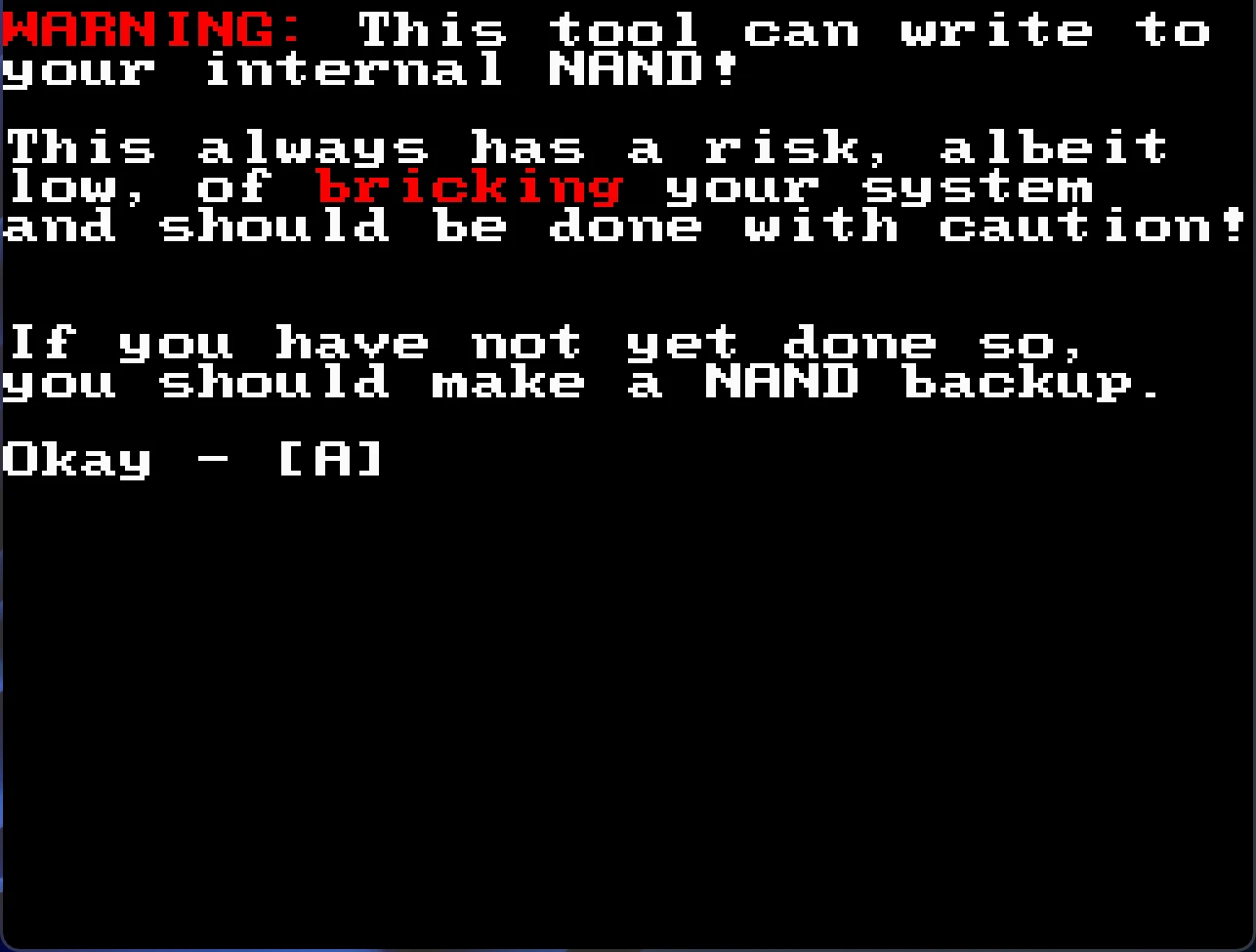 请在完成备份后将 SD 卡插入电脑,把创建的 NAND 备份(bin 文件)存储在其他安全的位置,如果 NAND 备份被损坏则无法进行接下来的操作。
