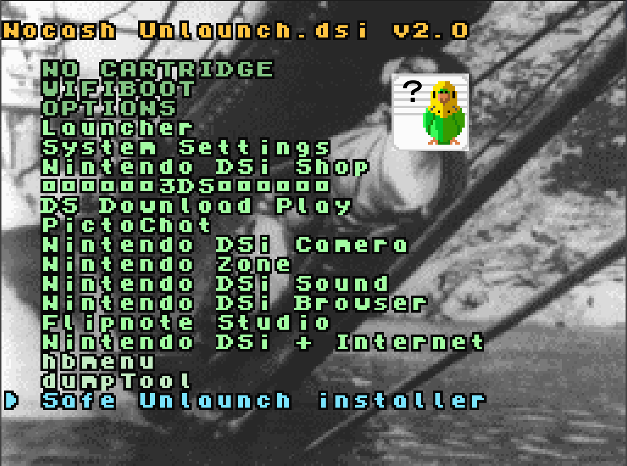 接下来按下电源键。如果出现 Unlaunch 的主界面(全英文字母),恭喜你成功安装Unlaunch。你可以通过十字键将光标移动到Launcher选项,按A 即可进入你的DSi 菜单。