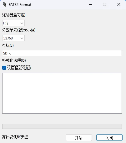 2.打开guiformat.exe,盘符选择插入的存储卡 (注意不要选到本地磁盘),勾选快速格式化,开始格式化。